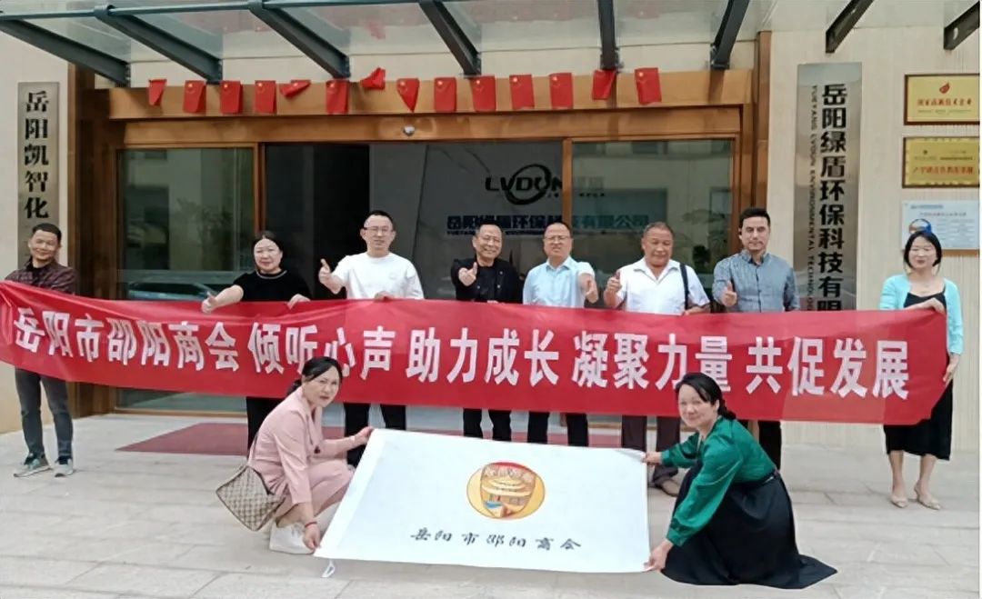 4月16日,岳阳市邵阳商会由会长李溯清带队,副会长兼执行秘书长曾斌、秘书长尹绥梅、副秘书长刘萍、朱春晓、会员企业负责人唐晓明、罗璨琪一行走访岳阳绿盾环保科技有限公司。